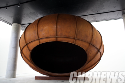 그라운드 갤러리에는 그의 초기 작업인 거대한 코텐 스틸 작품 '동굴'이 관람객을 압도한다. 지름 8미터, 무게 15톤의 거대한 타원형 작품이지만 불안정한 상태로 설치되어 어둠과 불안감을 동시에 안겨 준다. 이곳에 카푸어의 안료 작업의 대표작인 '붉은 색의 은밀한 부분을 반영하기'라는 작품이 조화를 이뤄 전시장의 긴장감을 완화시키고 있다. 또한 세 개의 벽면에 설치된 '무제'는 보이드 작업이 형식적 개념적으로 절정에 있던 시기의 작품으로, 안팎을 뒤덮은 검푸른 분말안료가 빛을 흡수해버리고 어둠의 심연을 만들어 낸다. 이 공간에서 놓치지 않고 봐야할 작품은 건물의 벽면을 이용한 '내가 임신했을 때'로 흰 벽면에서 아롱거리던 미지의 환영이나 신기루처럼 보여 세심한 주의를 하지 않으면 형체를 알아 볼 수 없을 정도의 묘한 느낌을 부여하고 있다. 색깔을 중심으로 펼쳐진 카푸어의 작품을 오랜 시간 바라보다, 확 트인 야외 정원에 놓여 있는 '큰 나무와 눈' 작업은 스테인리스 스틸 작품으로 릴케의 시집 '오르페우스에게 바치는 소네트'에서 영감을 받은 작품으로 알려져 있다. 죽은 아내를 되찾기 위해 땅 밑 죽음의 세계로 들어갔던 오르페우스의 신화를 소재로 한 릴케의 시에는 삶과 죽음, 이승과 저승, 현실과 신화 등 대립적인 영역을 넘나드는 시인의 상상력과 이미지로 가득하다. 아니쉬 카푸어의 예술은 동서양의 문화의 만남으로 해석되곤 한다. 하지만 그의 작업은 단순히 이질적인 두 문화의 만남을 넘어, 보다 보편적이고 신비로운 우주적인 세계를 지향하며, 그것은 곧 인간과 자연 본연의 진리에 다가가는 것을 의미한다 왕진오 기자