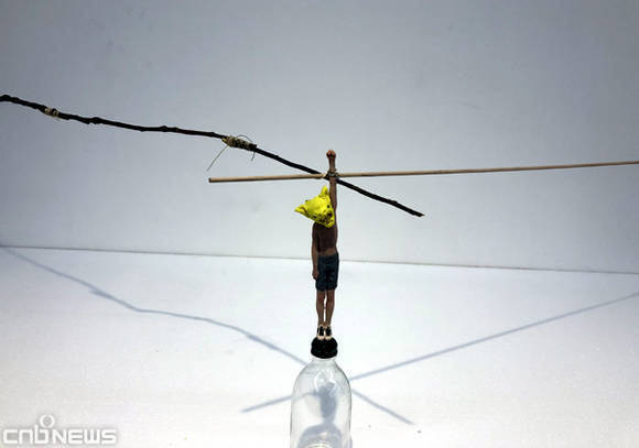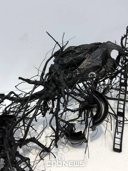 이동욱의 작업에서는 결합 방식이 돋보인다. 스컬피로 만든 인간 형상, 트로피, 수집한 돌, 검은색 비닐봉지, 나뭇가지 등 다양한 수집물들을 쌓거나 이어붙이는 식으로 결합해 하나의 거대한 조각을 구현했다. 그리고 이번 전시에서 선보이는 작품들에는 인간상이 빠지지 않고 등장한다. 뾰족한 나무 사이 방황하고 있거나 높은 곳에 위태롭게 위치하고 있는 등 극한 상황에 치달아 있는 모습이다. 작가는 “오브제들을 결합할 때 인간상을 넣고 나서야 비로소 완성되는 느낌이 들었다”고 말했다.