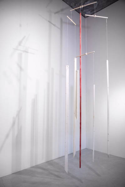 설치 작품인 ‘모빌’ 작업은 균형과 이해의 범주에 대한 작업이다. 모빌은 봉이 길수록 심플하게 걸릴 수 있는 범위가 많아 균형 잡기가 쉬워지지만, 작가는 오히려 봉을 짧게 잡아 움직임의 예민함을 보여준다. 폭이 좁아질수록 작가가 이야기하는 ‘가까워지지 않는 지점에 대한 균형’의 이야기가 근접하게 닿아 있다. 모빌을 설치하는 과정이 담긴 미디어도 함께 전시된다.