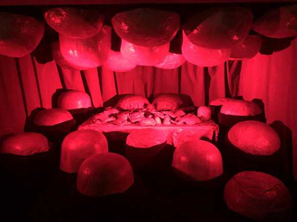 작가는 “어린 시절 식탁에서 아버지의 자기과시에 지친 가족들이 그를 끌어내려 사지를 찢고 먹어 치우는 상상을 했다”고 고백한 바 있는데, 이 분노가 고스란히 아버지의 파괴 작업에 반영됐다. 무대와 같이 정면만 열린 구성, 강렬한 붉은 조명, 내부를 들여다볼 수 있게 하는 방식은 마치 인간의 내장을 들여다보는 것 같기도, 감추고 싶었던 내면이 적나라하게 까발리는 듯한 오싹한 느낌도 준다.