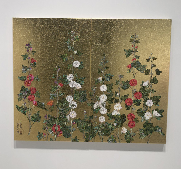 작가는 “수년 전 에도시대를 다룬 쇼군(장군) 드라마를 방영했는데 그 시대 시각으로 작업한 작품”이라며 “금박은 일본 미술사에서 자주 사용된 기법이다. 17세기 당시 채광이 잘 들지 않는 교토의 집들이 촛불 빛을 반사해 집을 밝히기 위해 많은 집에서 해당 그림을 걸었다”고 설명했다. 가고시안 갤러리 측은 “현대미술의 최전방에 서 있는 무라카미가 17세기 전통 화가 오가타 고린을 레퍼런스해 작품으로 재해석했다는 점에서 특별한 작품”이라고 부연했다.