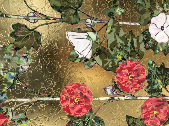 해골 문양이 양각된 금박의 화면 위를 슈퍼플랫 플라워로 한가득 채운 ‘썸머 베케이션 플라워스 언더 더 골든 스카이(Summer Vacation Flowers under the Golden Sky)’(2025)는 이번 전시의 대표작이다. 만화경에서 쏟아져 나온 듯 만개한 꽃들로 가득한 풍경이 파노라마처럼 펼쳐지는 모습이 인상적이다.