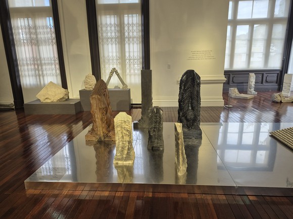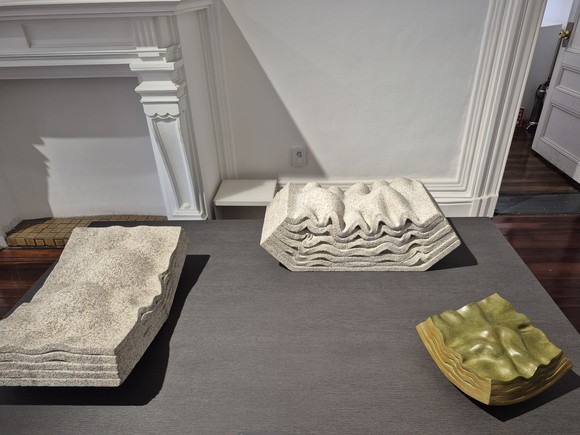 자연의 형태를 만드는 물리적 힘과 비가시적 에너지를 담어내고자 했던 작가는 마치 얇은 면이 층층히 쌓인 뒤 어떠한 힘이 가해져 굴곡이나 주름, 접힘 등 변형이 일어난 듯한 형태를 완성한다. 작가는 다루기 쉽지 않은 돌, 나무, 금속 같은 당단한 전통 조각 재료를 고수해 마치 천이나 반죽 같은 부드러운 재료가 눌려서 주름지고, 중력에 늘어지고 졉혀서 솟아오른 것처럼 절묘하게 표현한다. 여기서 재료의 물성과 보이는 것에서 연상되는 물성 사이의 간극이 발생해 흥미로움을 자아낸다.