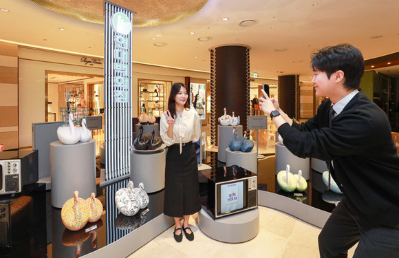 17일 오전, 서울 강남구에 위치한 현대백화점 압구정본점 3층 팝업존에서 열린 ‘현대, 예술이 된 시간’ 전시에서 고객들이 기념사진을 촬영하고 있다. 사진=현대백화점