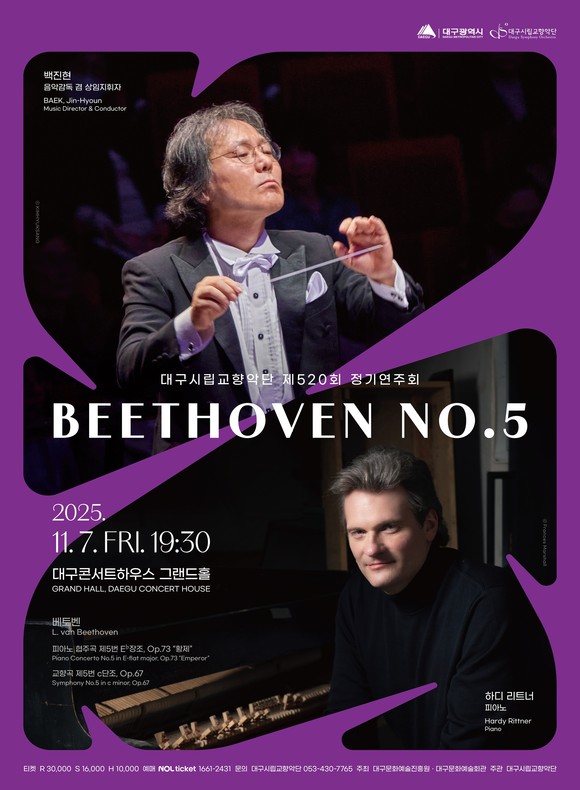 대구시립교향악단(이하 대구시향)이 오는 11월 7일(금) 오후 7시 30분, 대구콘서트하우스 그랜드홀에서 <제520회 정기연주회>를 개최한다. ‘베토벤 No.5’를 부제로 한 이번 무대에서는 베토벤의 대표작인 피아노 협주곡 제5번 “황제”와 교향곡 제5번이 함께 연주되어, 웅장한 스케일과 극적인 서사로 관객을 사로잡을 예정이다.