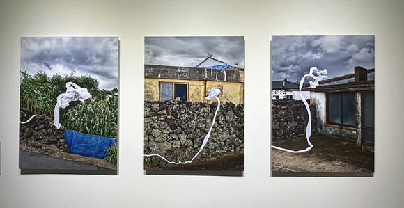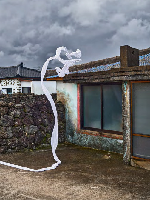 두 작가의 협업작 ‘폭풍의 주름 속에’(2023)는 삶과 죽음을 상징하는 한국 전통 천 ‘소창’이 제주도의 홍수 피해 마을을 떠도는 모습을 담고 있다. 이 작품은 사라져가는 전통, 생태위기, 조용한 회복의 가능성을 환기시킨다.