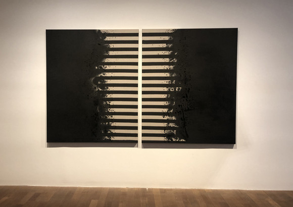 특히 무한 기둥을 평면화한 신작 회화 ‘무제(Untitled)’도 이 공간에서 함께 볼 수 있다. 수직으로 상승하는 기둥의 형태를 수평으로 전환하고, 먹의 농담을 통해 그 형태가 스며들고 배어 나오는 과정을 반복한 작품이다.