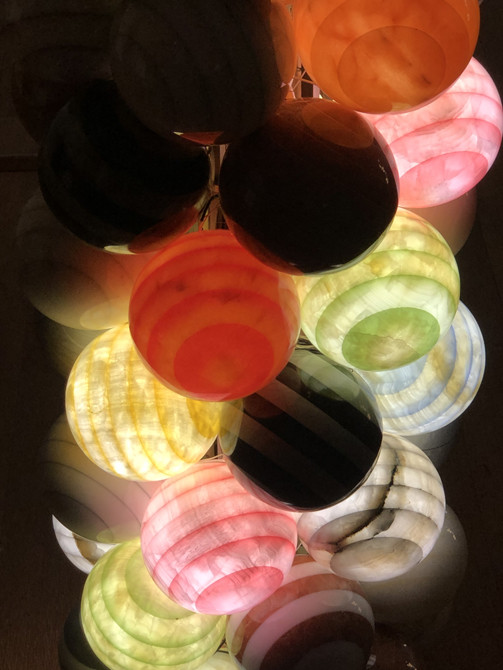 전시장 2층에서도 새 시도를 이어간 작가의 작업들을 볼 수 있다. 눈에 띄는 건 매끈한 표면의 대리석 구가 알알이 매달려 기둥을 이룬 ‘무한 기둥-확산’이다. 조각가에게 가장 큰 약점은 ‘색’이라 할 수 있다. 자연 그대로의 자료를 활용하기 때문. 하지만 작가는 대리석 구 내부를 파내 8mm 두께로 만든 다음 LED 등을 담아 이 한계를 깼다. 이 작품은 코로나19 사태 당시 나온 작업이다.