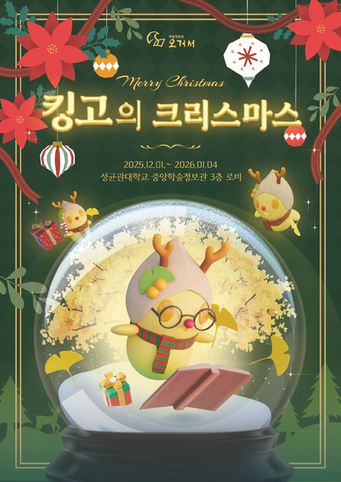 이번 전시는 성균관대를 상징하는 은행나무와, 이를 모티프로 제작한 캐릭터 ‘킹고 피어리’를 앞세운 프로그램을 운영한다. ‘은행나무와 함께 즐기는 크리스마스’를 콘셉트로, 킹고 피어리와 함께 아날로그적인 책 읽기 경험에 디지털 기술과 예술적 연출을 결합해 잘파(Zalpha) 세대 학생들과 소통한다.