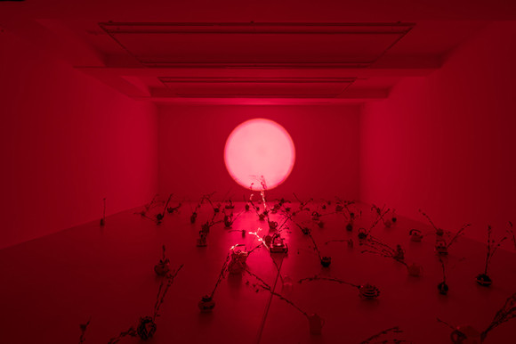 계단을 내려가면 노을 지는 풍경처럼 바닥과 벽면 영상을 배경으로 찻주전자 96개가 여기 저기 놓여있다. 찻주전자는 작가가 직접 전부 수집한 것들이다. 찻주전자에 꽂힌 쑥내음과 찻주전자의 물 끓는 소리가 들린다. 작가는 이 소리를 ‘섬세하게 우리의 촉각을 자극하는 매체’라고 설명했다. 소리는 붉게 물든 공간을 이리저리 돌아다니며 우리에게 쉴 수 있는 공간을 내어준다.