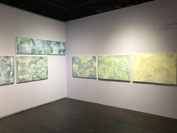또 다른 공간에서는 한지가 하늘부터 지상까지 너풀너풀 내려오는 듯 작품을 배치해 놓았다. 마치 한지의 숲 사이를 거니는 느낌이었다. 방울이 맺혀있는 듯 독특한 무늬도 눈에 띄었다. 강 큐레이터는 “동글동글한 무늬는 작가가 한지를 자연 건조할 때 갑자기 비가 내렸는데, 빗방울 흔적의 결과물”이라며 “자연스럽게 생긴 이 형태에 영감을 받은 안 한지장은 이후 샤워기를 한지에 뿌리는 등 여러 방법으로 의외성을 불어넣는 작업도 이어오고 있다. 자연스러운 번짐이 피어난 화면은 마치 우주의 별들을 보는 것 같기도 하다”고 말했다.