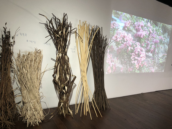한지의 주재료인 닥나무와 작가가 직접 쓰는 작업 도구 등도 이번 전시에서 만날 수 있다. 사진=김금영 기자