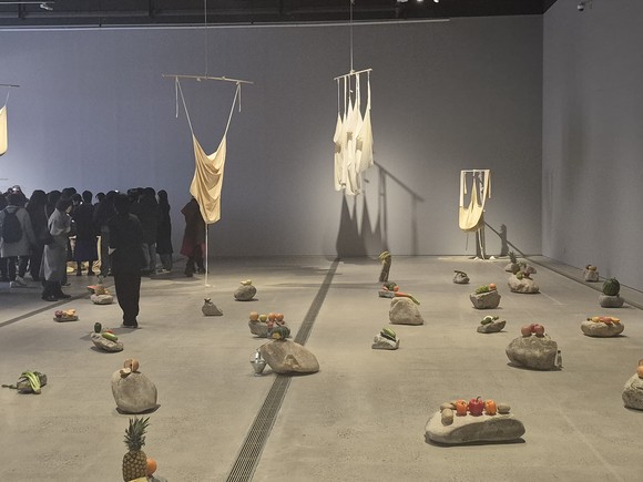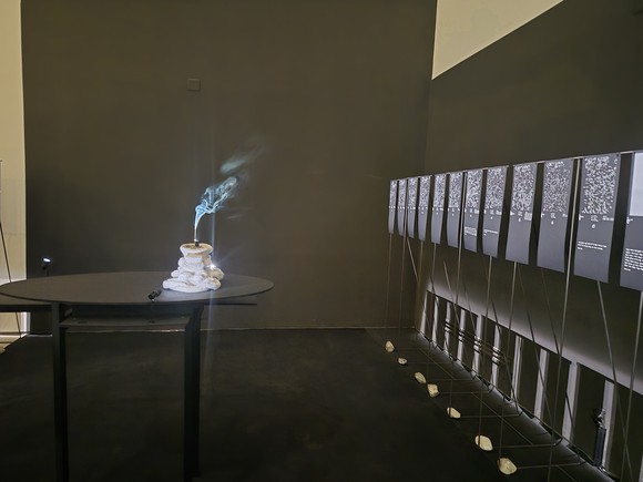 이와 같은 발견은 피어오르는 연기의 춤을 감상하자고 제안하는 여다함의 〈향연〉(2025), 썩어가는 과일에서 비롯된 에너지로 빛을 밝히고 연주를 이어가는 유코 모리(Yuko Mohri)의 〈분해〉(2026)로 이어진다. 여다함 작가는 춤추는 연기, 즉 피어오르는 연기가 바람의 움직임과 함께 그것이 어떤 식으로 변화하는지를 상세하게 살펴볼 수 있다. 특히 작가의 무대는 뜨개질로 만들어져 있다. 뜨개질은 연기가 실이 풀려나가는 것처럼 그 뜨개질을 통해 선에서 면으로, 면에서 다시 입체로 유동적인 현상을 붙여나간다.