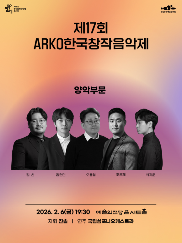한국문화예술위원회(위원장 정병국, 이하 아르코)와 한국창작음악제추진단(단장 이건용)이 주최하는 대한민국의 대표 창작음악제 ‘ARKO한국창작음악제(이하 아창제)’양악부문 연주회가 오는 2월 6일(화)에 예술의전당 콘서트홀에서 열린다.