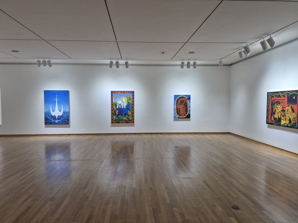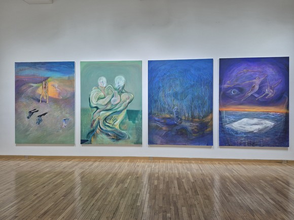 서 작가는 자신의 그림에 대해 이렇게 말했다. “3층의 두 공간에서 제가 생각하는 시간의 규모나 제가 느꼈던 이야기, 상상을 그림으로 풀어냈는데, 바깥 전시실은 낮의 무대라고 생각하고 그림을 그렸고, 안쪽 전시실의 작품은 밤의 무대라는 생각으로 그림을 그렸습니다. 안쪽 방의 4개의 큰 그림들은 계절들이라는 제목으로 인생의 봄, 여름, 가을, 겨울을 그려봤어요. 예를 들어 겨울 그림은 환상의 이미지들이 위에 비춰져 있고 아래에 얼어 있는 호수를 그려, 커다란 얼굴의 형상처럼 표현했습니다. 가을 같은 경우에는 중년의 모습을 생각하면서 저도 이제 곧 맞이할 시간을 생각했어요. 주변에 있는 작가들을 관찰하며 그림을 그렸는데 겉으로 보기에는 너무 잘하고 있지만 그들만의 고민이 많고 그래서 마치 나무들처럼 꽉 막혀 있는 것 같은 모습을 옆에서 지켜보면서 앞이 꽉 막힌 나무들이 하나의 길처럼 보였으면 좋겠다고 생각했어요.”