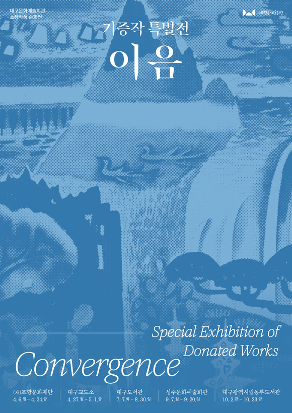 대구문화예술회관 소장작품 순회전 《기증작 특별전: 이음》전시는 (재)포항문화재단(4.6.(월)~4.24.(금))을 시작으로 대구교도소(4.27.(월)~5.1.(금)), 대구도서관(7.7.(화)~8.30.(일)), 성주문화예술회관(9.7.(월)~9.20.(일)), 대구광역시립동부도서관(10.2.(금)~10.23.(금))에서 순차적으로 개최될 예정이다.