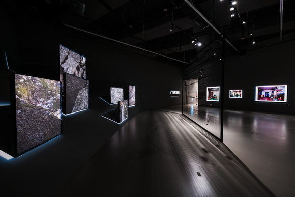 뮌 작가는 전시실 중앙에 붉은 커튼이 배치된 대형 사진이 놓이며, 샹들리에 아래 무대 막을 연상시키는 이미지는 커튼 뒤로 비치는 사물의 그림자와 함께 실재와 가상이 겹쳐진 장면을 구성한다.